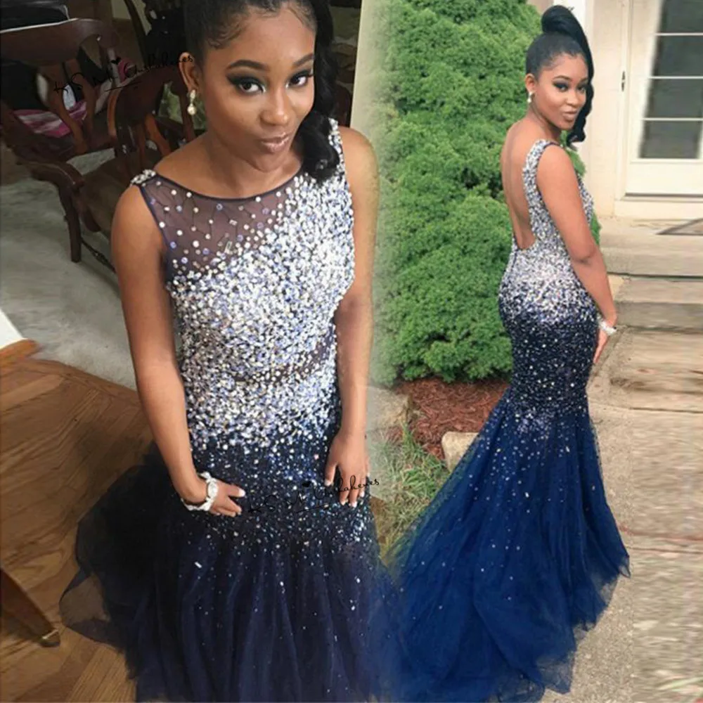 Abendkleider 2019 Navy Blue Luxury Evening Dresses Mermaid Long Evening Gowns Backless Crystals Women Beads Prom Party Dress