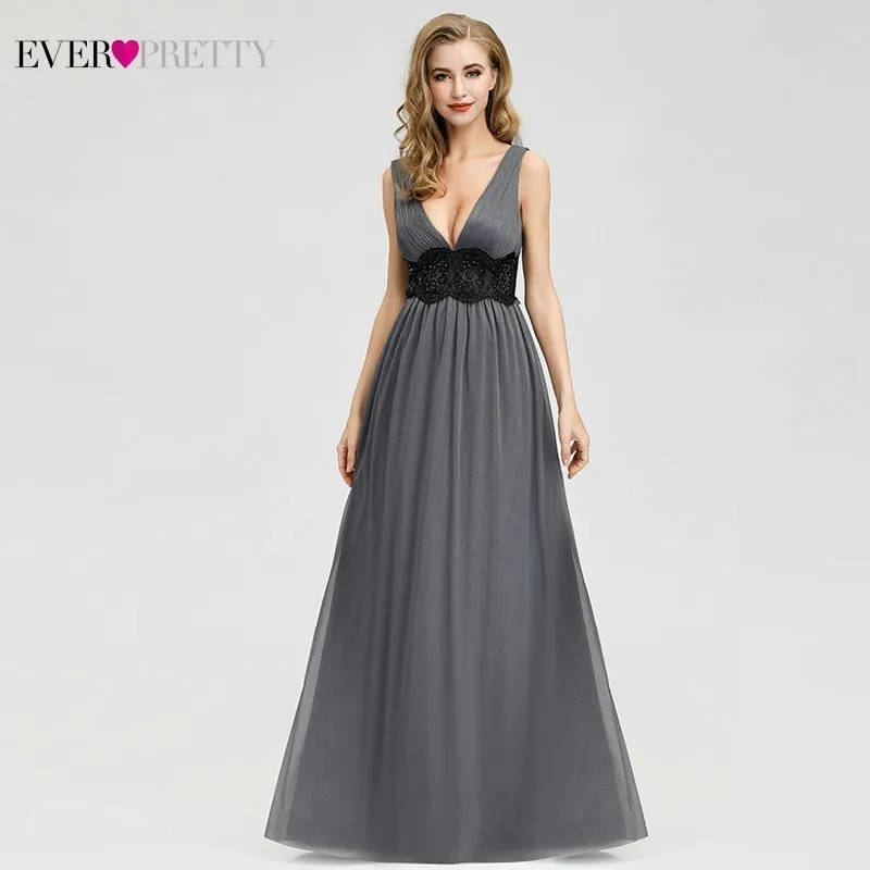 Elegant Grey Evening Dresses Long Ever Pretty EP07880GY A-Line V-Neck Beaded Formal Party Dresses Vestidos De Fiesta De Noche