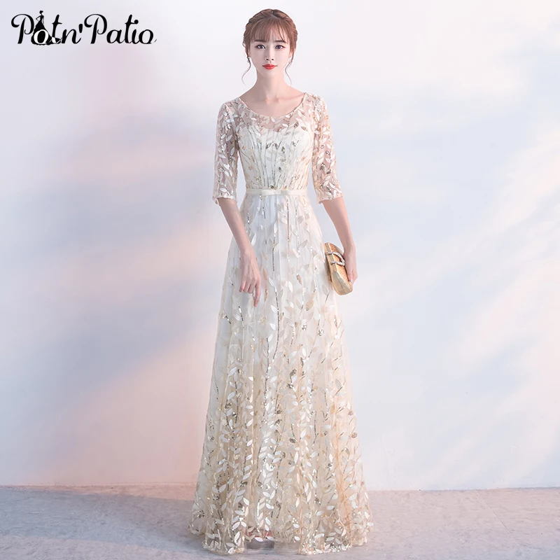 Special Price for Elegant Evening Dresses Long 2018 New Floor-length Champagne Formal Dress Plus Size Half Sleeves Lace Evening Gowns For Women Promo