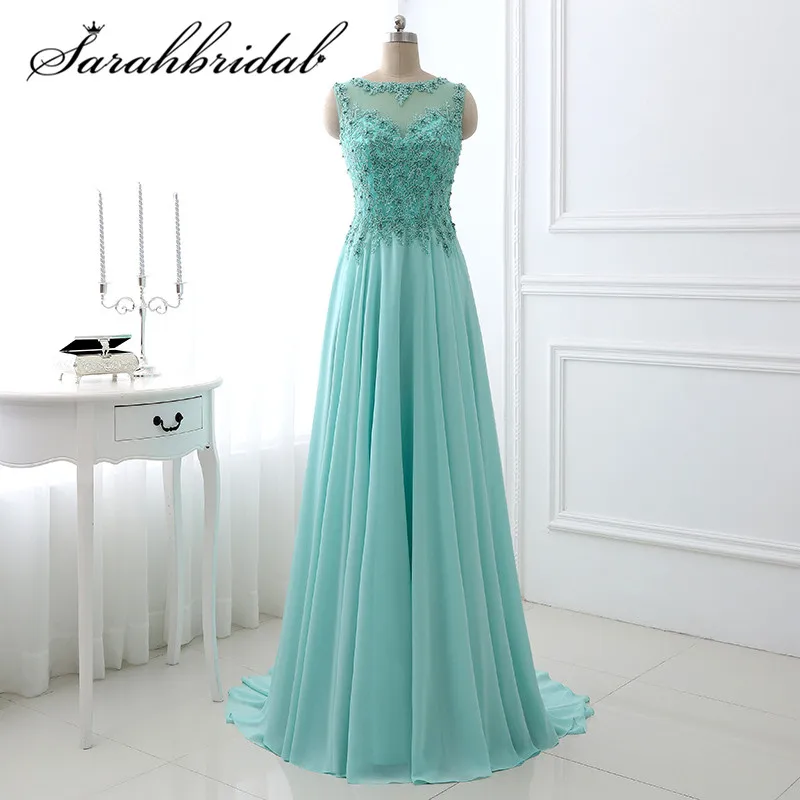 Mint Evening Dresses Long hot Sheer Jewel Neck Lace Applique Beaded Robe De Soiree Real Photo Backless Prom Party Gown LX329